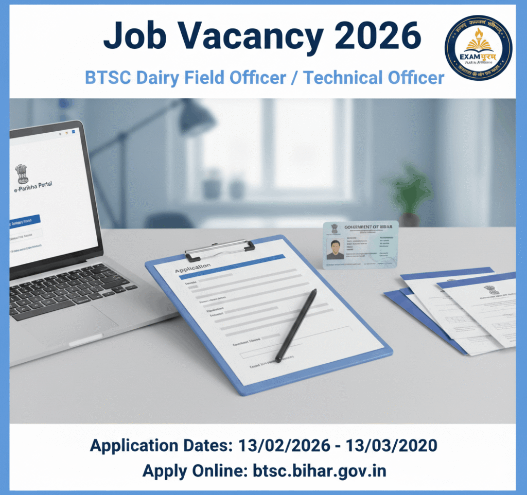 Bihar Technical Service Commission (BTSC) has released the official notification for the Bihar Dairy Field Officer / Dairy Technical Officer Recruitment 2026. Candidates who are interested in this vacancy can apply online during the re-open application window from 13 February 2026 to 13 March 2026.