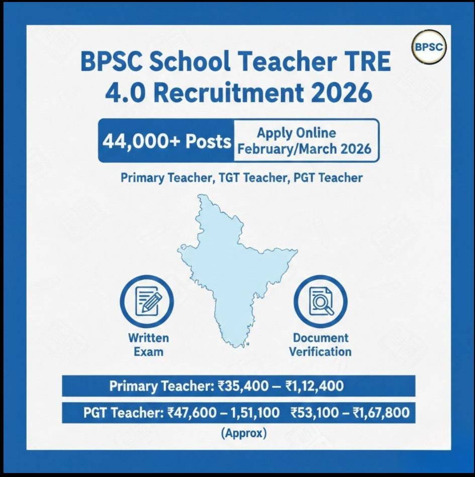 Bihar Public Service Commission (BPSC) has announced the School Teacher TRE 4.0 Recruitment 2026 for 44,000+ teaching posts. This recruitment includes Primary, Middle, Secondary, TGT, PGT, and Special School Teacher positions under the Education Department and SC & ST Welfare Department of the Government of Bihar. Eligible candidates for teaching posts from Class 1 to 12 can apply online as per the scheduled dates. Before applying, candidates must carefully read the official notification to check eligibility criteria, post-wise details, selection process, age limit, pay scale, and other important instructions. This is a huge opportunity for aspiring teachers to join Bihar’s education system.