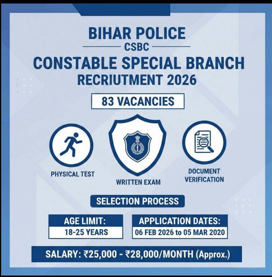 Central Selection Board of Constable (CSBC) has released the official notification for Bihar Police Constables (General Duty – Special Branch) under Advt. No. 01/2026.