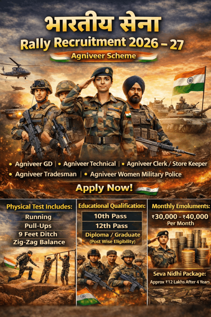 Indian Army has released the Army Rally Recruitment 2027 Notification for Agniveer posts including GD, Technical, Clerk, Agniveer Women, Sepoy Pharma, and Soldier Technical under ARO and ZRO rallies.